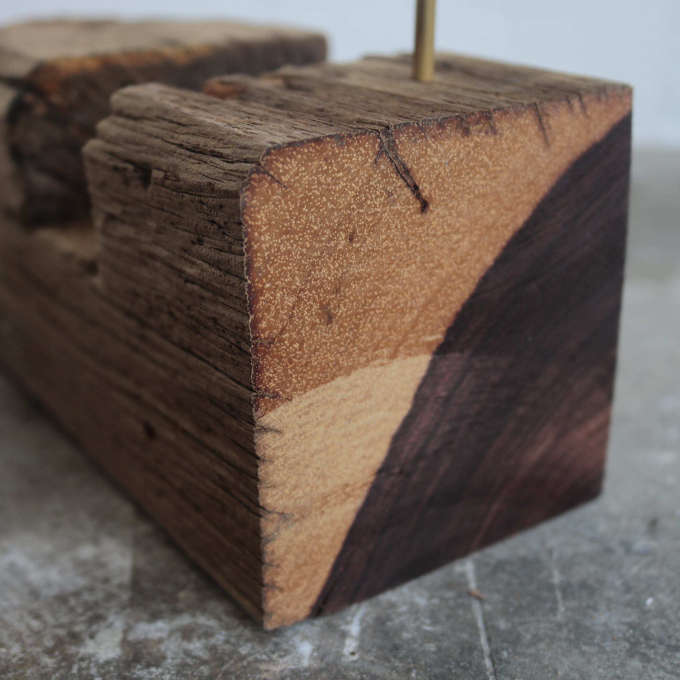 古材の形状や状態に合わせて3か所に取付穴を開けています。