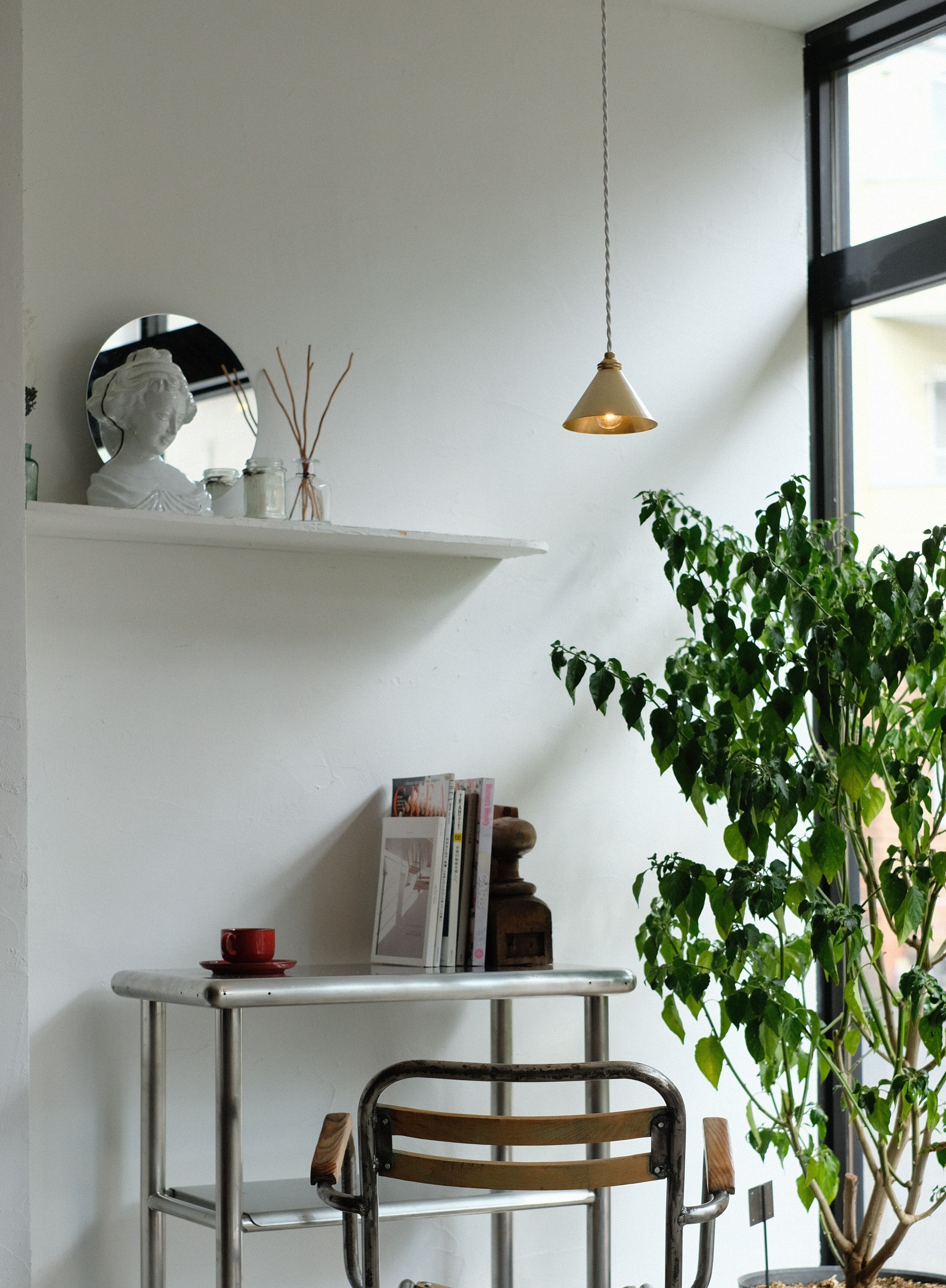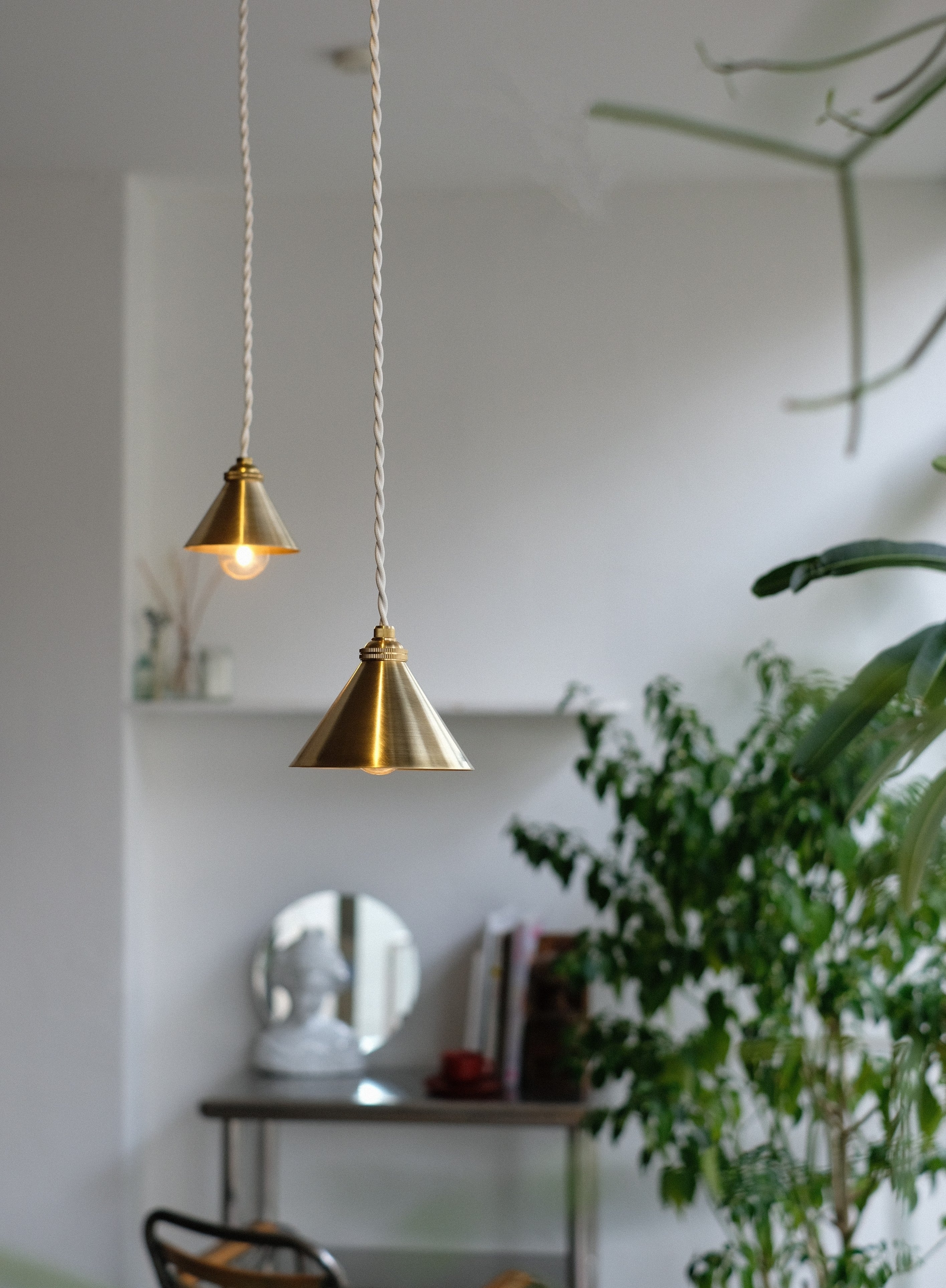 Sサイズよりもシェードに深さがあるため、ミニ電球がすっぽりと収まります。直接光源が見えにくくなるので、目線の位置に取り付けても眩しくなく、真下に柔らかく光を落とすスポットライトのような使い方ができ、空間にほどよい陰影とアクセントを生み出します。