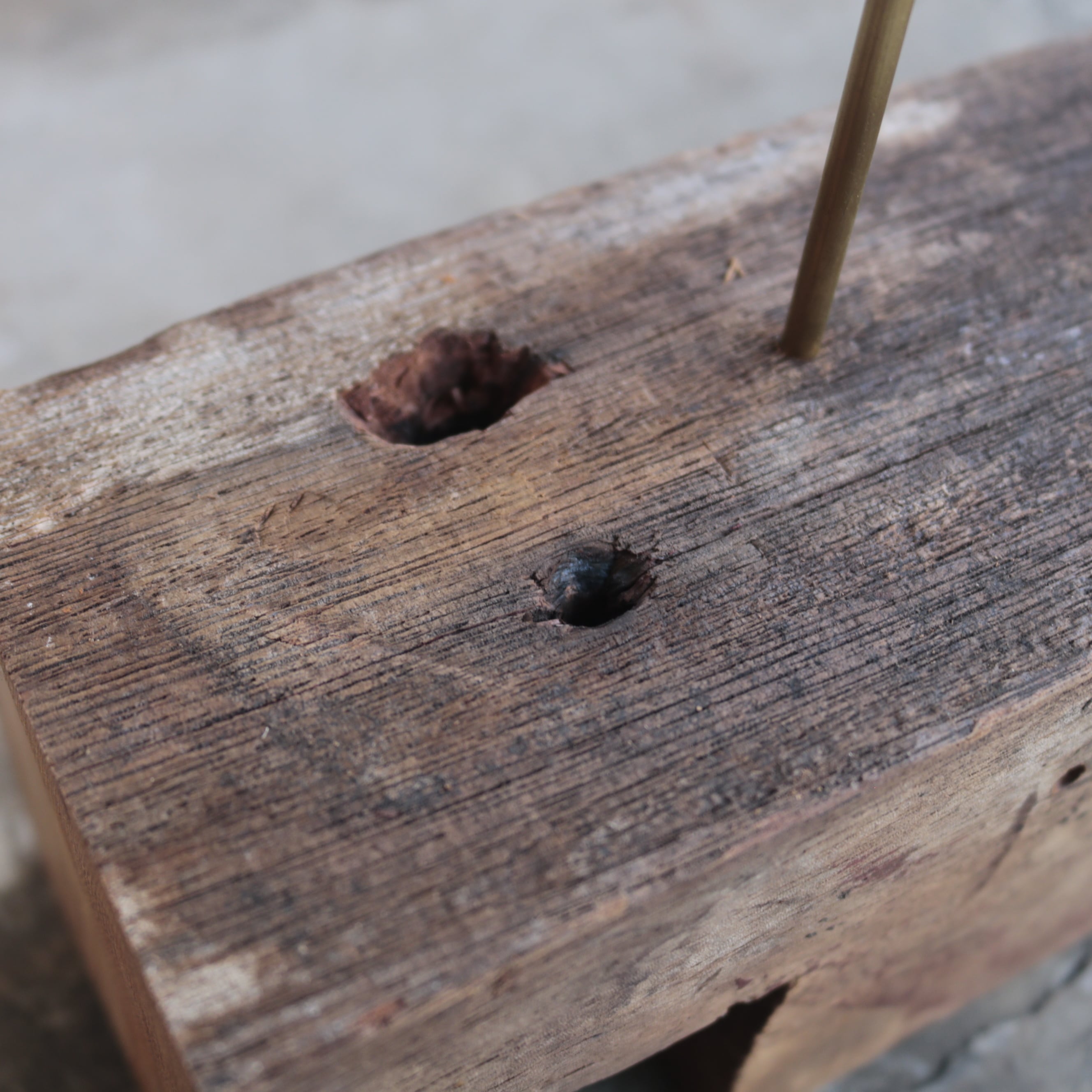 古材の形状や状態に合わせて3か所に取付穴を開けています。(画像10~12枚目)